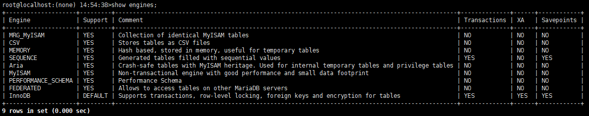 root@localhost:(none) >show engines;