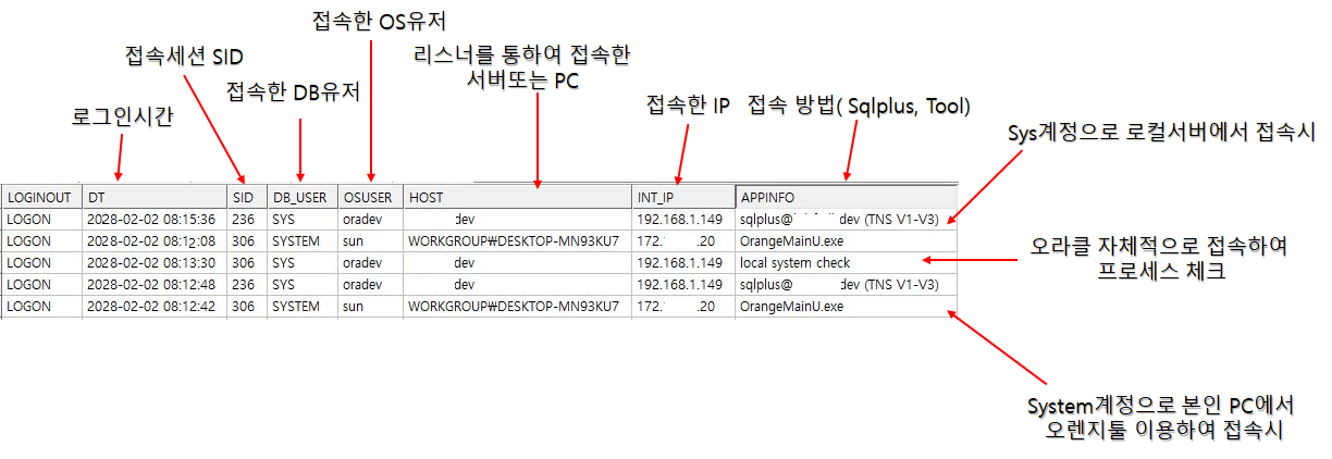 oracle db내 접속한 유저(DB,OS) 및 접속 시간, 접속한 IP, 접속한 방법(Tool) 테이블로 로그 남기기
